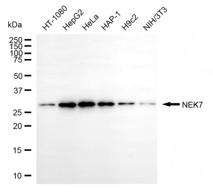 • Western blotting analysis using NEK7 antibody. Total cell lysates (30 μg) from various cell lines were loaded and separated by SDS-PAGE. The blot was incubated with NEK7 antibody and HRP-conjugated goat anti-rabbit secondary antibody respectively.