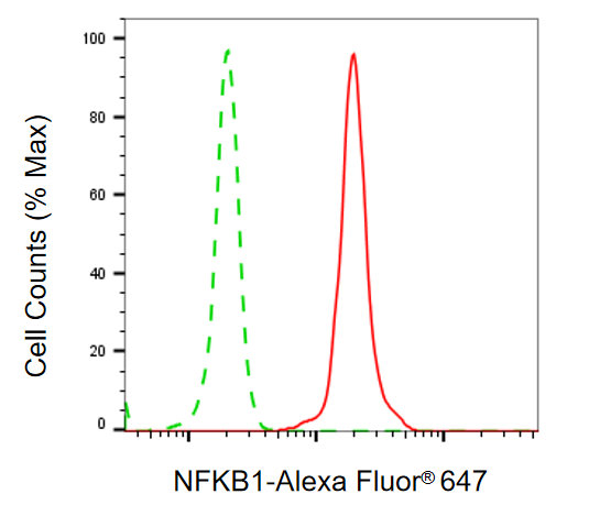 • Flow cytometric analysis of NFKB1 expression in C2C12 cells using NFKB1 antibody. Green, isotype control; red, NFKB1.