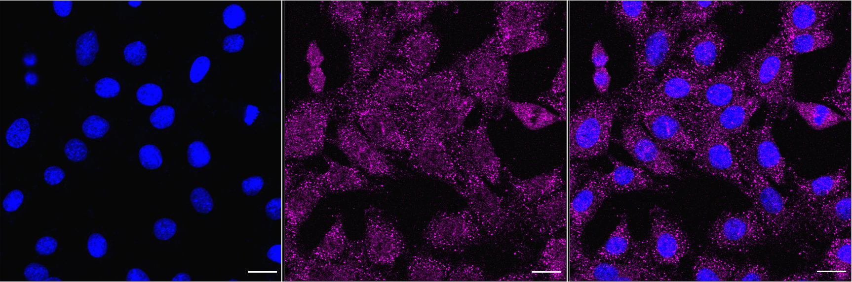 • Immunocytochemical staining of C2C12 cells with NFKB1 antibody. Nuclei were stained blue with DAPI; NFKB1 was stained magenta with Alexa Fluor? 647. Images were taken using Leica stellaris 5. Protein abundance based on laser Intensity and smart gain: Medium. Scale bar, 20 μm.