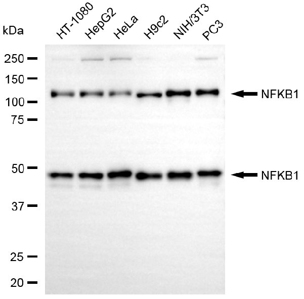 • Western blotting analysis using NFKB1 antibody. Total cell lysates (30 μg) from various cell lines were loaded and separated by SDS-PAGE. The blot was incubated with NFKB1 antibody and HRP-conjugated goat anti-rabbit secondary antibody respectively.