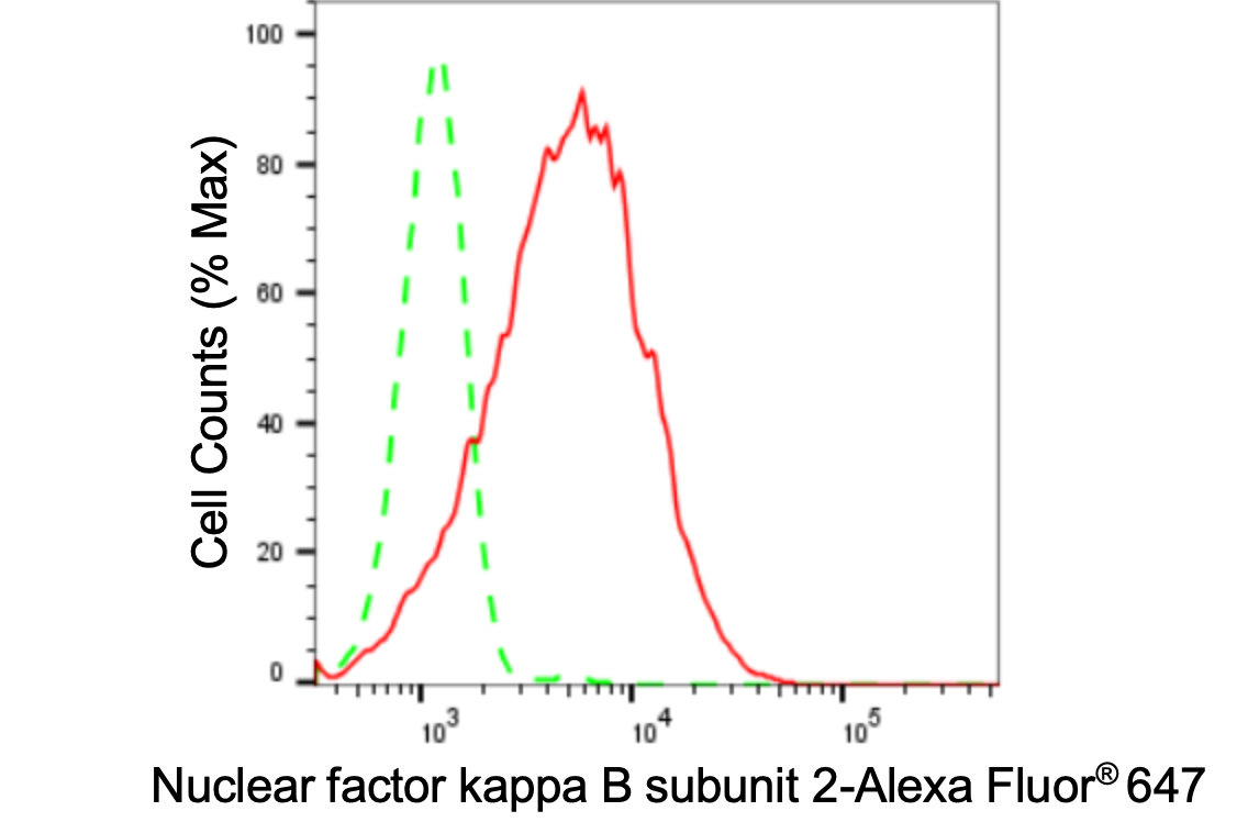 Flow cytometric analysis of Nuclear factor kappa B subunit 2 expression in HepG2 cells using Nuclear factor kappa B subunit 2 antibody. Green, isotype control; red, Nuclear factor kappa B subunit 2.