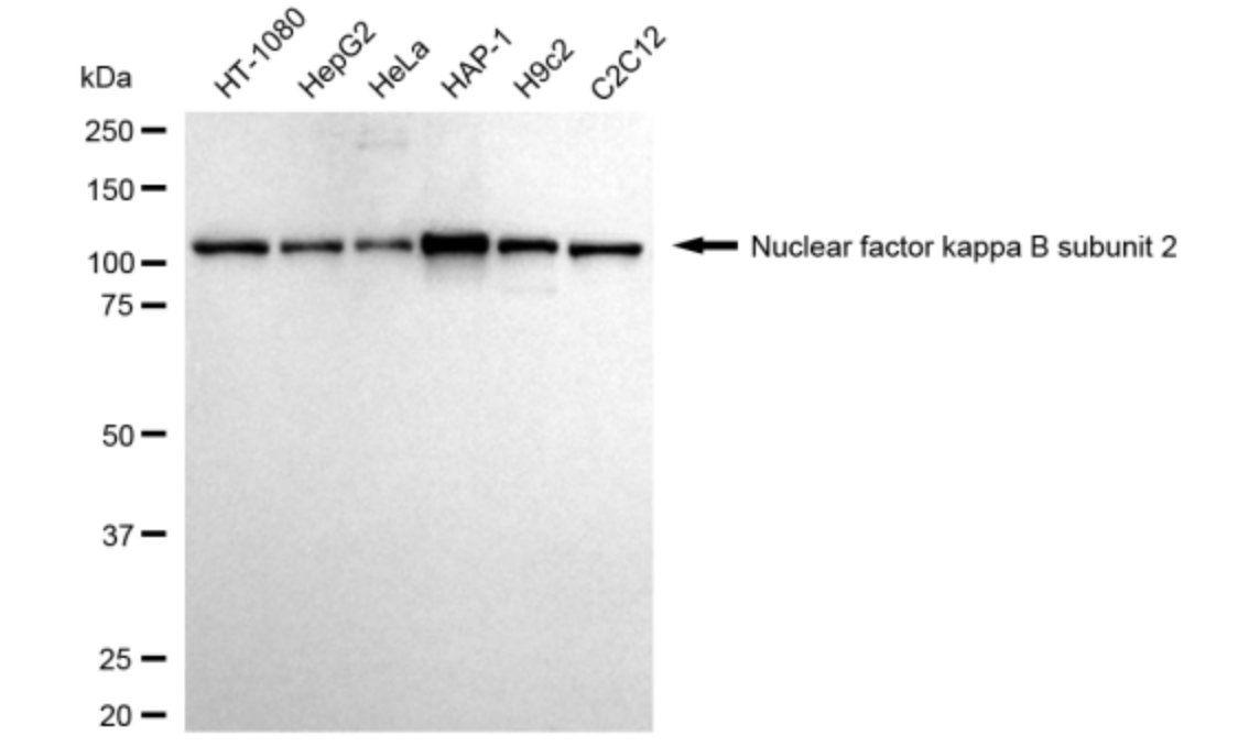 Western blotting analysis using Nuclear factor kappa B subunit 2 antibody. Total cell lysates (30 μg) from various cell lines were loaded and separated by SDS-PAGE. The blot was incubated with Nuclear factor kappa B subunit 2 antibody and HRP-conjugated goat anti-rabbit secondary antibody respectively.