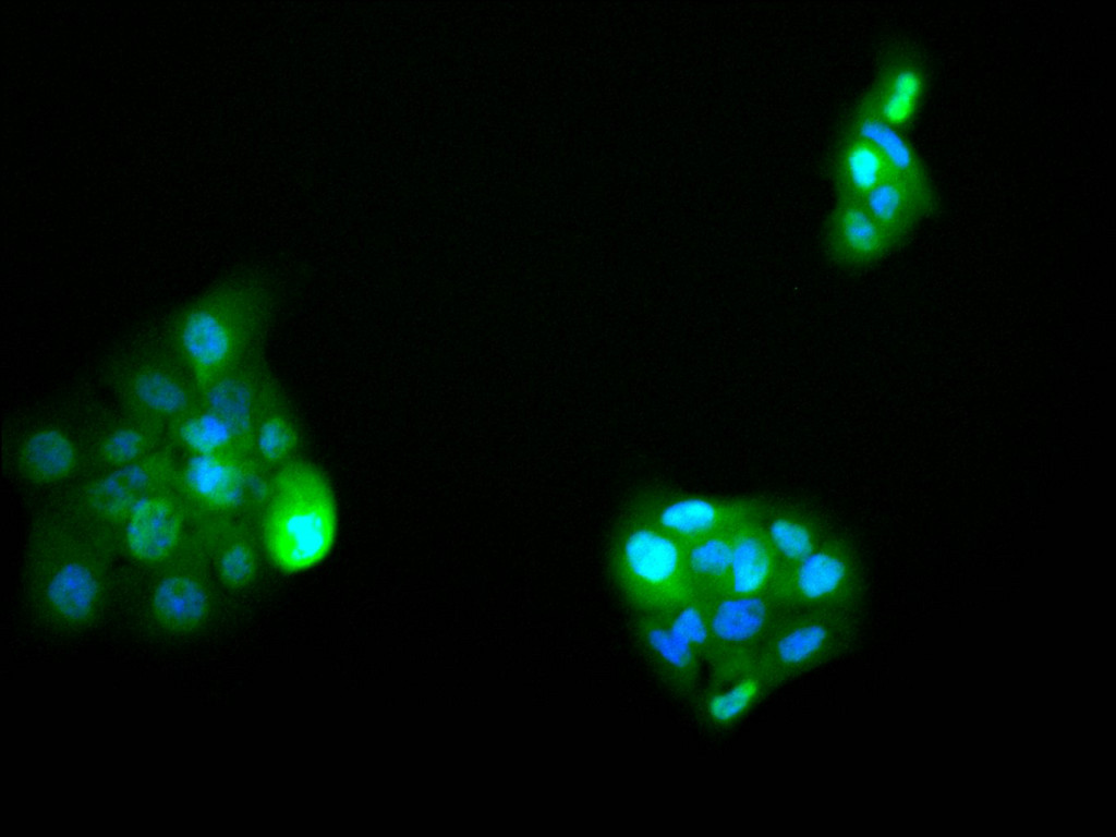 • Immunofluorescence staining of A431 cell with CSB-RA288692A0HU at 1:50, counter-stained with DAPI. The cells were fixed in 4% formaldehyde, permeabilized using 0.2% Triton X-100 and blocked in 10% normal Goat Serum. The cells were then incubated with the antibody overnight at 4°C. The secondary antibody was Alexa Fluor 488-congugated AffiniPure Goat Anti-Rabbit IgG(H+L).
