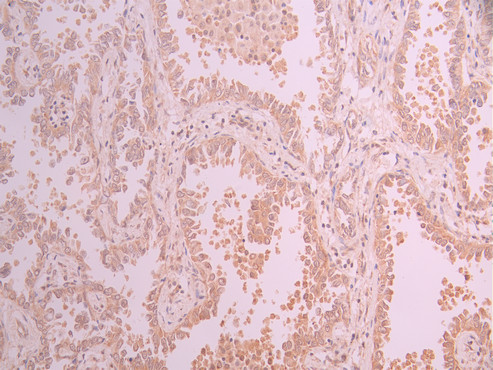 • IHC image of CSB-RA288692A0HU diluted at 1:100 and staining in paraffin-embedded human lung cancer performed on a Leica BondTM system. After dewaxing and hydration, antigen retrieval was mediated by high pressure in a citrate buffer (pH 6.0). Section was blocked with 10% normal goat serum 30min at RT. Then primary antibody (1% BSA) was incubated at 4°C overnight. The primary is detected by a Goat anti-rabbit polymer IgG labeled by HRP and visualized using 0.05% DAB.