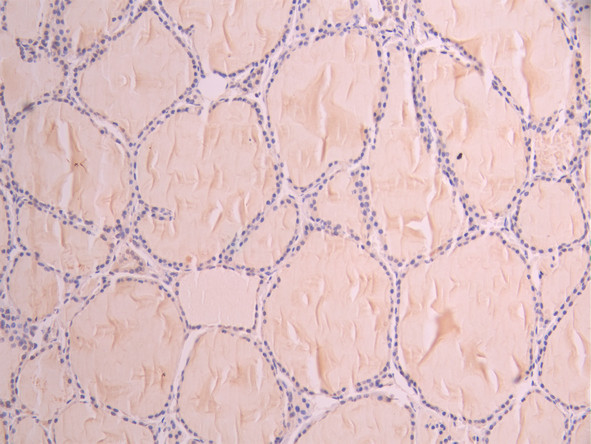 • IHC image of CSB-RA288692A0HU diluted at 1:100 and staining in paraffin-embedded human thyroid tissue performed on a Leica BondTM system. After dewaxing and hydration, antigen retrieval was mediated by high pressure in a citrate buffer (pH 6.0). Section was blocked with 10% normal goat serum 30min at RT. Then primary antibody (1% BSA) was incubated at 4°C overnight. The primary is detected by a Goat anti-rabbit polymer IgG labeled by HRP and visualized using 0.05% DAB.