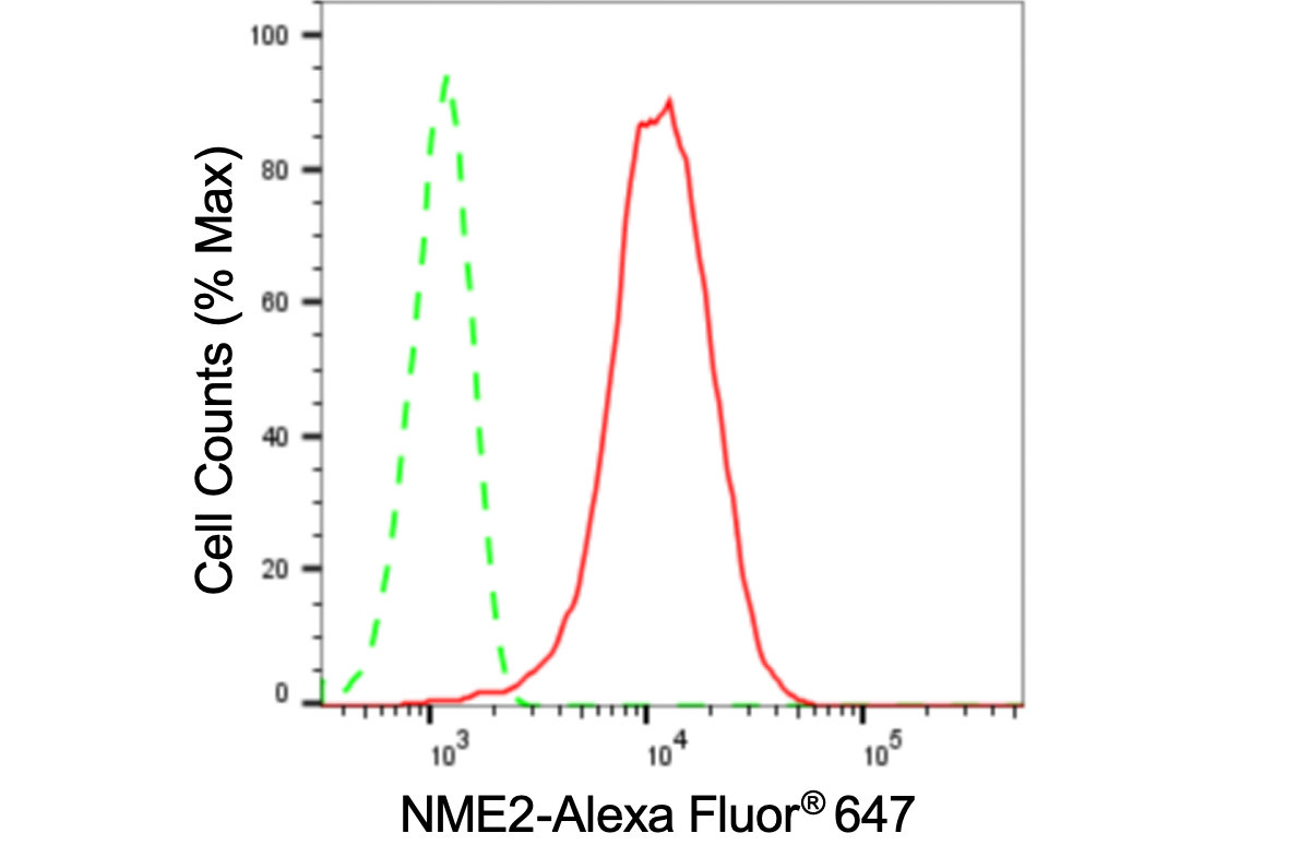 Flow cytometric analysis of NME2 expression in HepG2 cells using NME2 antibody. Green, isotype control; red, NME2.