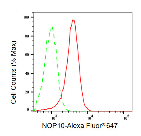 • Flow cytometric analysis of NOP10 expression in HepG2 cells using NOP10 antibody. Green, isotype control; red, NOP10.