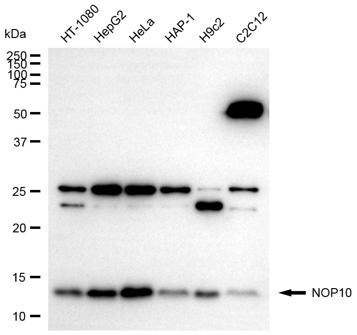 • Western blotting analysis using NOP10 antibody. Total cell lysates (30 μg) from various cell lines were loaded and separated by SDS-PAGE. The blot was incubated with NOP10 antibody and HRP-conjugated goat anti-rabbit secondary antibody respectively.