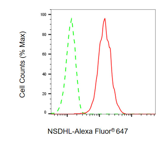 Flow cytometric analysis of NSDHL expression in HeLa cells using NSDHL antibody. Green, isotype control; red, NSDHL.