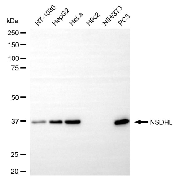 Western blotting analysis using NSDHL antibody. Total cell lysates (30 μg) from various cell lines were loaded and separated by SDS-PAGE. The blot was incubated with NSDHL antibody and HRP-conjugated goat anti-rabbit secondary antibody respectively.