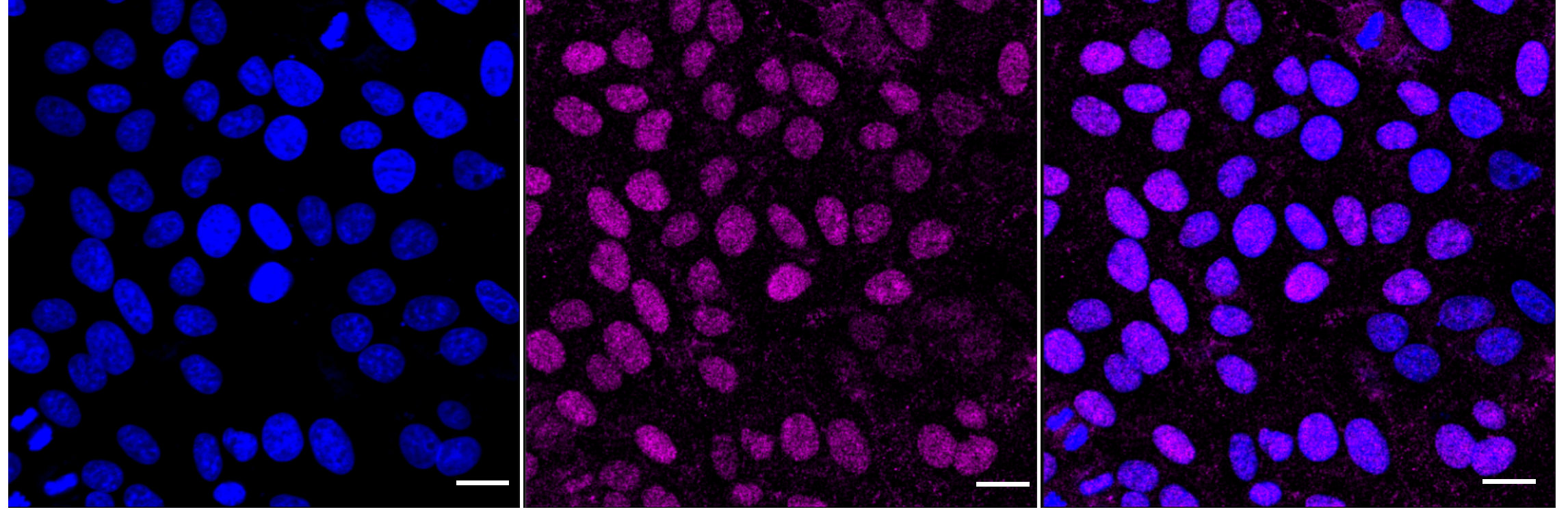 Immunocytochemical staining of HepG2 cells with Nth like DNA glycosylase 1antibody. Nuclei were stained blue with DAPI; Nth like DNA glycosylase 1 was stained magenta with Alexa Fluor? 647. Images were taken using Leica stellaris 5. Protein abundance based on laser Intensity and smart gain: Medium. Scale bar: 20 μm.