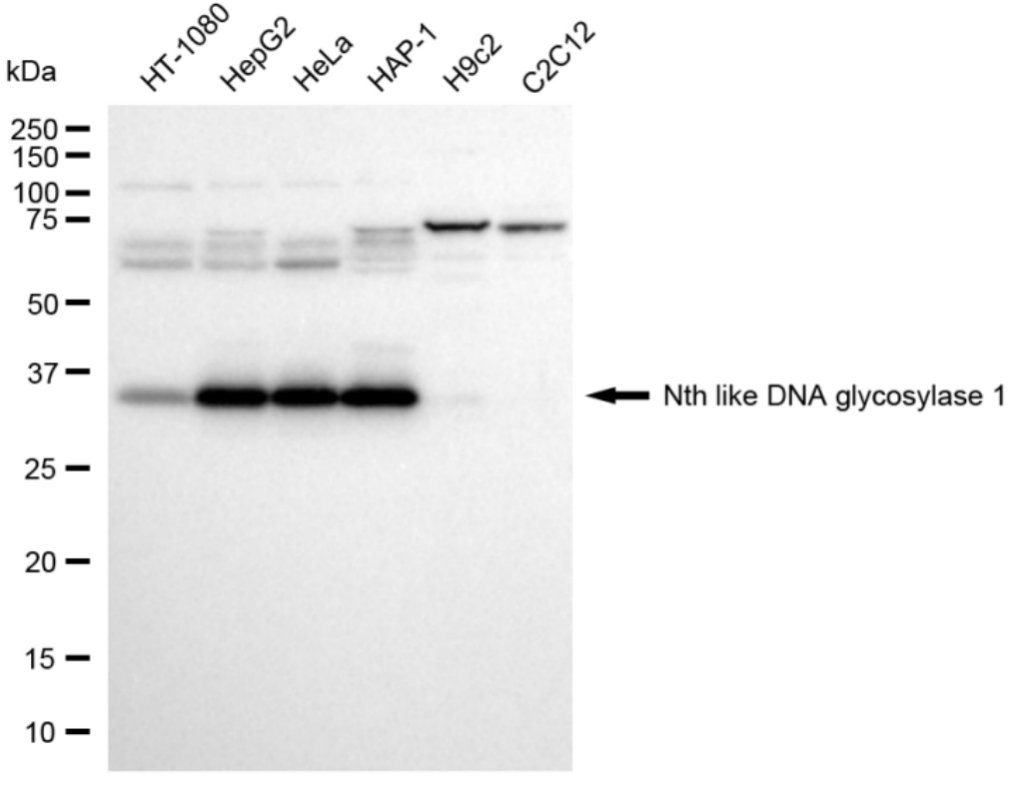 Western blotting analysis using Nth like DNA glycosylase 1 antibody. Total cell lysates (30 μg) from various cell lines were loaded and separated by SDS-PAGE. The blot was incubated with Nth like DNA glycosylase 1 antibody and HRP-conjugated goat rabbit secondary antibody respectively.