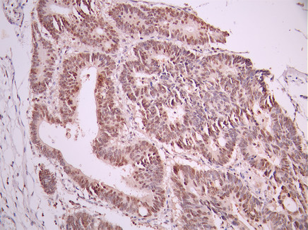 IHC image of CSB-RA588009A0HU diluted at 1:100 and staining in paraffin-embedded human colorectal cancer performed on a Leica BondTM system. After dewaxing and hydration, antigen retrieval was mediated by high pressure in a citrate buffer (pH 6.0). Section was blocked with 10% normal goat serum 30min at RT. Then primary antibody (1% BSA) was incubated at 4°C overnight. The primary is detected by a Goat anti-rabbit polymer IgG labeled by HRP and visualized using 0.05% DAB.