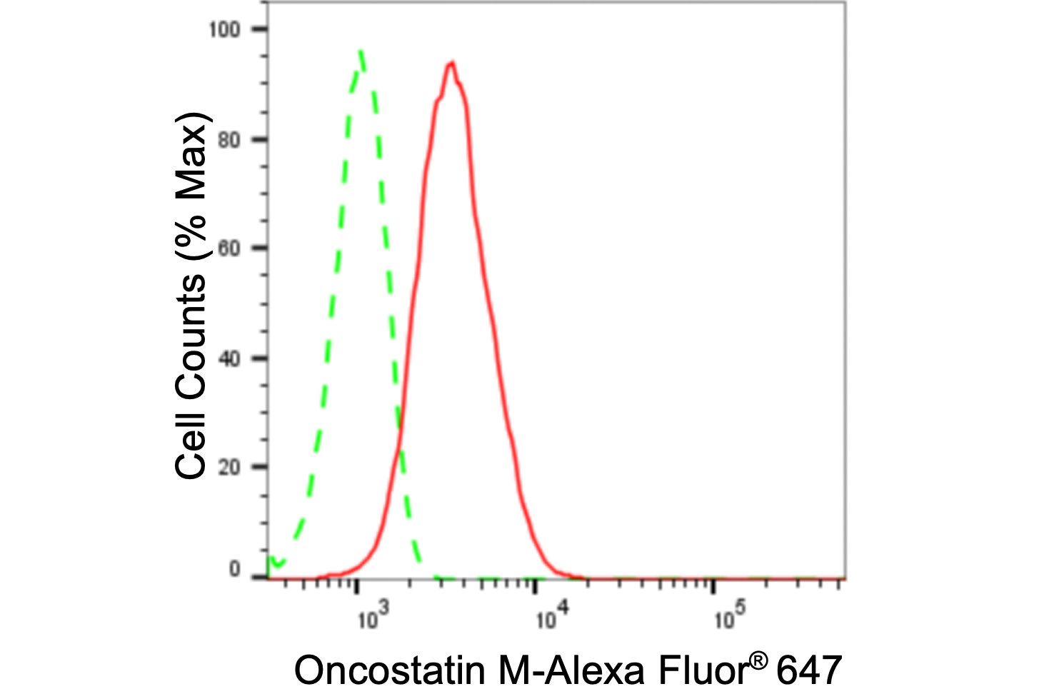 Flow cytometric analysis of Oncostatin M expression in HepG2 cells using Oncostatin M antibody. Green, isotype control; red, Oncostatin M.