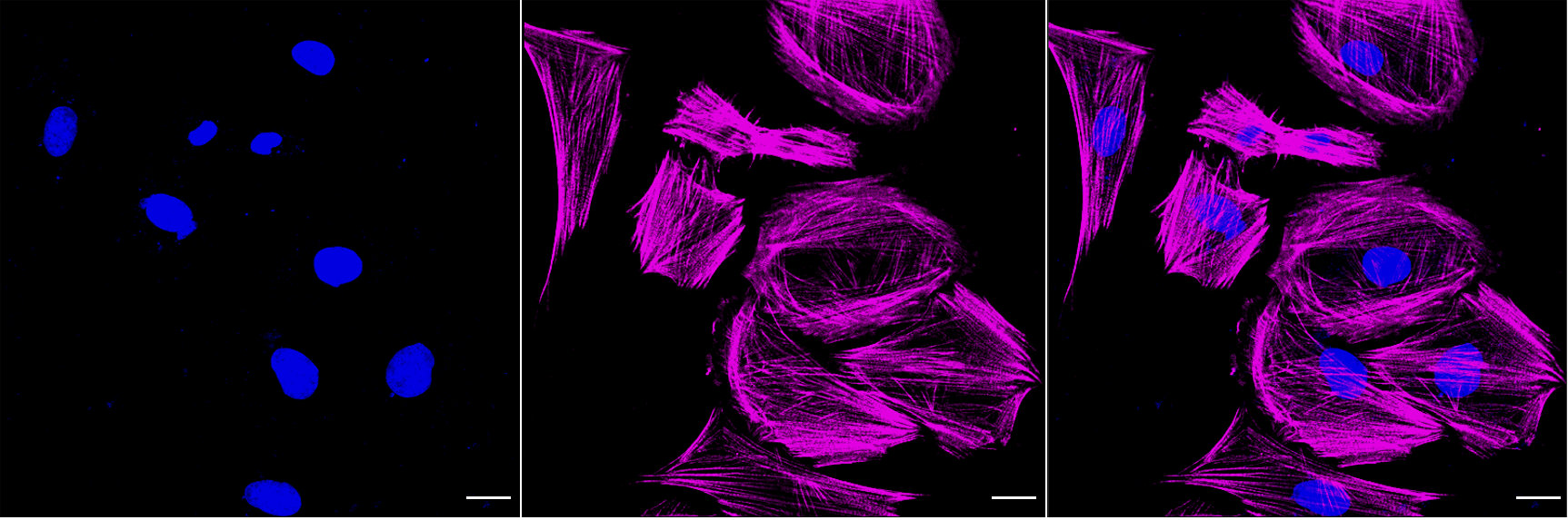 Immunocytochemical staining of H9C2 cells with oxoglutarate receptor 1 antibody. Nuclei were stained blue with DAPI; Oxoglutarate receptor 1 was stained magenta with Alexa Fluor? 647. Images were taken using Leica stellaris 5. Protein abundance based on laser Intensity and smart gain: High. Scale bar, 20 μm.