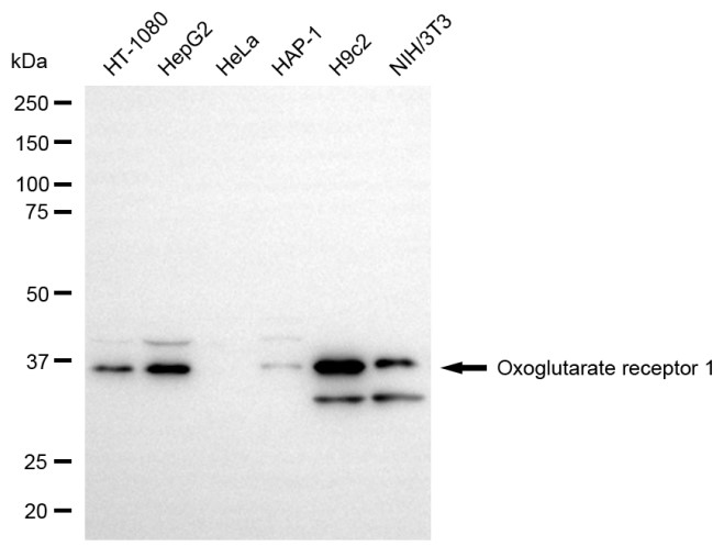 Western blotting analysis using oxoglutarate receptor 1 antibody. Total cell lysates (30 μg) from various cell lines were loaded and separated by SDS-PAGE. The blot was incubated with oxoglutarate receptor 1 antibody and HRP-conjugated goat anti-rabbit secondary antibody respectively.