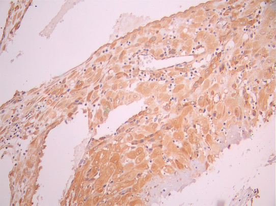 IHC image of CSB-RA268805A0HU diluted at 1:100 and staining in paraffin-embedded human placenta tissue performed on a Leica BondTM system. After dewaxing and hydration, antigen retrieval was mediated by high pressure in a citrate buffer (pH 6.0). Section was blocked with 10% normal goat serum 30min at RT. Then primary antibody (1% BSA) was incubated at 4°C overnight. The primary is detected by a Goat anti-rabbit polymer IgG labeled by HRP and visualized using 0.05% DAB.