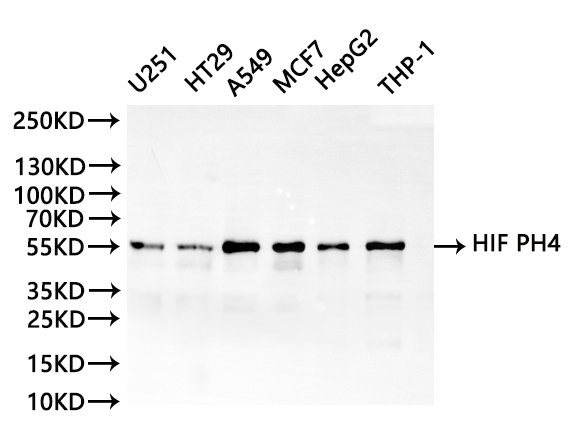 Positive WB detected in: U-251MG whole cell lysate(30μg), HT-29 whole cell lysate(30μg), A549 whole cell lysate(30μg), MCF-7 whole cell lysate(30μg), HepG2 whole cell lysate(30μg), THP-1 whole cell lysate(30μg)