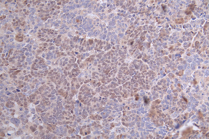 • IHC image of CSB-RA248028A0HU diluted at 1:100 and staining in paraffin-embedded human ovarian cancer performed on a Leica BondTM system. After dewaxing and hydration, antigen retrieval was mediated by high pressure in a citrate buffer (pH 6.0). Section was blocked with 10% normal goat serum 30min at RT. Then primary antibody (1% BSA) was incubated at 4°C overnight. The primary is detected by a Goat anti-rabbit polymer IgG labeled by HRP and visualized using 0.59% DAB.