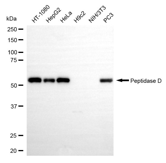 Western blotting analysis using peptidase D antibody. Total cell lysates (30 μg) from various cell lines were loaded and separated by SDS-PAGE. The blot was incubated with peptidase D antibody and HRP-conjugated goat anti-rabbit secondary antibody respectively.