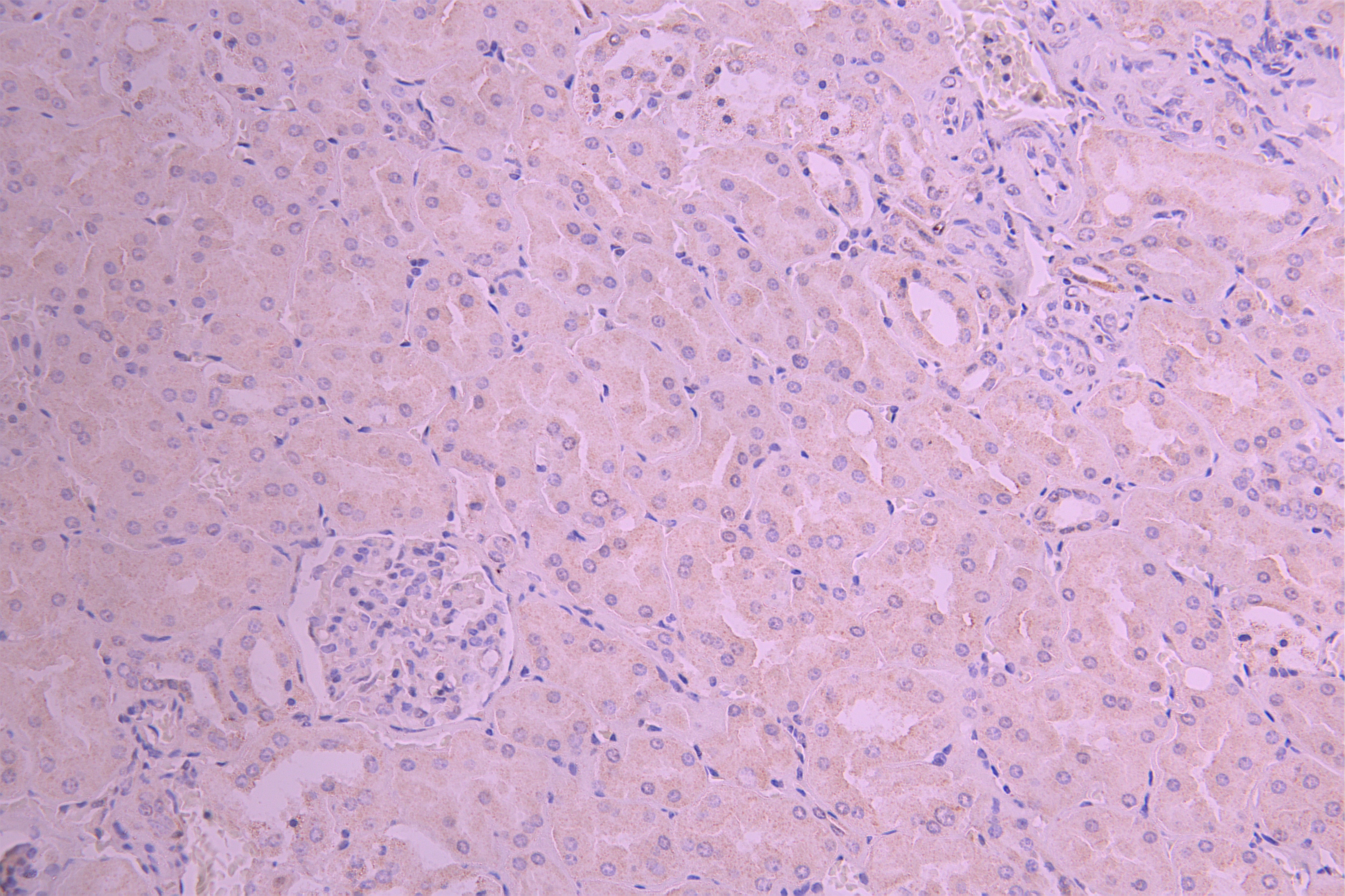 IHC image of CSB-RA552118A0HU diluted at 1:100 and staining in paraffin-embedded human kidney tissue performed on a Leica BondTM system. After dewaxing and hydration, antigen retrieval was mediated by high pressure in a citrate buffer (pH 6.0). Section was blocked with 10% normal goat serum 30min at RT. Then primary antibody (1% BSA) was incubated at 4°C overnight. The primary is detected by a Goat anti-rabbit polymer IgG labeled by HRP and visualized using 0.05% DAB.