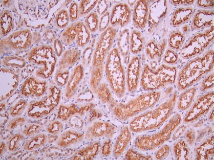 IHC image of CSB-RA121260A0HU diluted at 1:100 and staining in paraffin-embedded human kidney tissue performed on a Leica BondTM system. After dewaxing and hydration, antigen retrieval was mediated by high pressure in a citrate buffer (pH 6.0). Section was blocked with 10% normal goat serum 30min at RT. Then primary antibody (1% BSA) was incubated at 4°C overnight. The primary is detected by a Goat anti-rabbit polymer IgG labeled by HRP and visualized using 0.05% DAB.