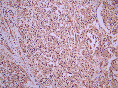 IHC image of CSB-RA121260A0HU diluted at 1:100 and staining in paraffin-embedded human liver cancer performed on a Leica BondTM system. After dewaxing and hydration, antigen retrieval was mediated by high pressure in a citrate buffer (pH 6.0). Section was blocked with 10% normal goat serum 30min at RT. Then primary antibody (1% BSA) was incubated at 4°C overnight. The primary is detected by a Goat anti-rabbit polymer IgG labeled by HRP and visualized using 0.05% DAB.
