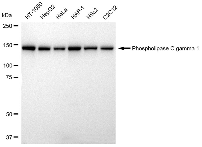 Western blotting analysis using Phospholipase C gamma 1 antibody. Total cell lysates (30 μg) from various cell lines were loaded and separated by SDS-PAGE. The blot was incubated with Phospholipase C gamma 1 antibody and HRP-conjugated goat anti-rabbit secondary antibody respectively.