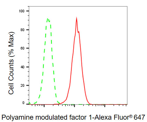 • Flow cytometric analysis of polyamine modulated factor 1 expression in HepG2 cells using polyamine modulated factor 1 antibody. Green, isotype control; red, polyamine modulated factor 1.