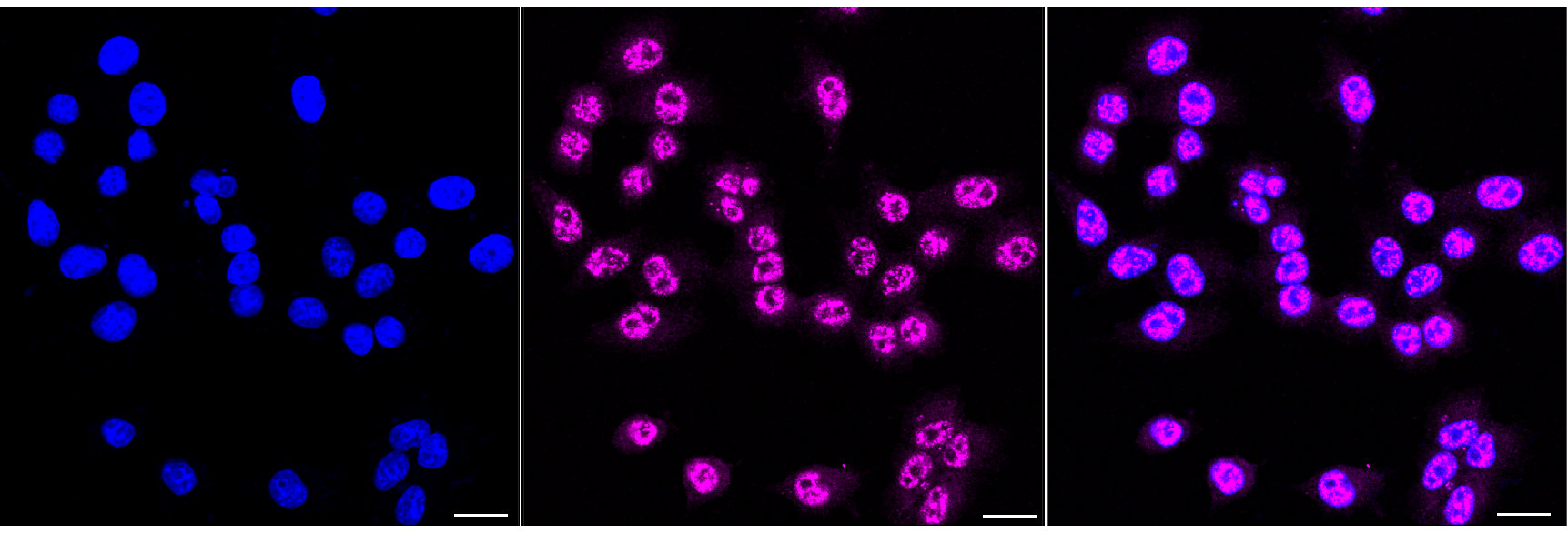 • Immunocytochemical staining of HepG2 cells with polyamine modulated factor 1 antibody. Nuclei were stained blue with DAPI; Polyamine modulated factor 1 was stained magenta with Alexa Fluor? 647. Images were taken using Leica stellaris 5. Protein abundance based on laser Intensity and smart gain: High. Scale bar, 20 μm.