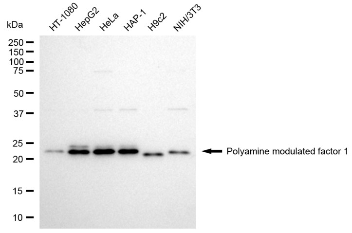 • Western blotting analysis using polyamine modulated factor 1 antibody. Total cell lysates (30 μg) from various cell lines were loaded and separated by SDS-PAGE. The blot was incubated with polyamine modulated factor 1 antibody and HRP-conjugated goat anti-rabbit secondary antibody respectively.