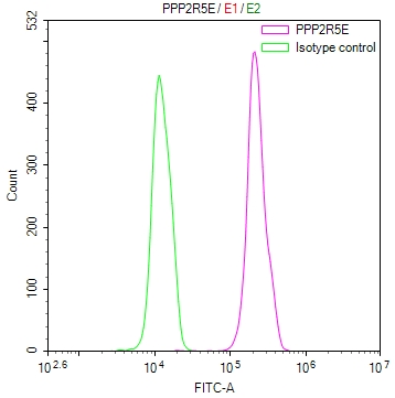 • Overlay Peak curve showing Hela cells stained with CSB-RA834341A0HU (red line) at 1:100. The cells were fixed in 4% formaldehyde and permeated by 0.2% TritonX-100 for 10min. Then 10% normal goat serum to block non-specific protein-protein interactions followed by the antibody (1ug/1*106cells) for 45min at 4℃. The secondary antibody used was FITC-conjugated goat anti-rabbit IgG (H+L) at 1/200 dilution for 35min at 4℃.Control antibody (green line) was Rabbit IgG (1ug/1*106cells) used under the same conditions. Acquisition of >10,000 events was performed.