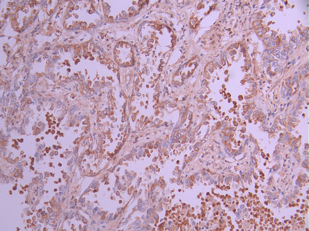 • IHC image of CSB-RA834341A0HU diluted at 1:100 and staining in paraffin-embedded human lung cancer performed on a Leica BondTM system. After dewaxing and hydration, antigen retrieval was mediated by high pressure in a citrate buffer (pH 6.0). Section was blocked with 10% normal goat serum 30min at RT. Then primary antibody (1% BSA) was incubated at 4°C overnight. The primary is detected by a Goat anti-rabbit polymer IgG labeled by HRP and visualized using 0.05% DAB.