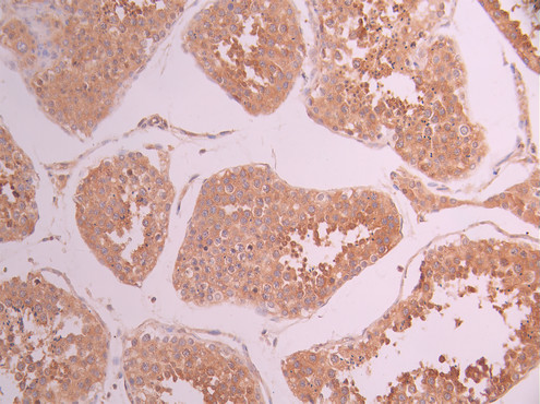 • IHC image of CSB-RA834341A0HU diluted at 1:100 and staining in paraffin-embedded human testis tissue performed on a Leica BondTM system. After dewaxing and hydration, antigen retrieval was mediated by high pressure in a citrate buffer (pH 6.0). Section was blocked with 10% normal goat serum 30min at RT. Then primary antibody (1% BSA) was incubated at 4°C overnight. The primary is detected by a Goat anti-rabbit polymer IgG labeled by HRP and visualized using 0.05% DAB.