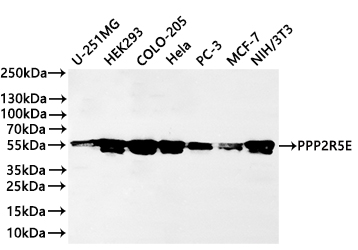 Positive WB detected in: U-251MG whole cell lysate(30μg), HEK293 whole cell lysate(30μg), COLO-205 whole cell lysate(30μg), Hela whole cell lysate(30μg), PC-3 whole cell lysate(30μg), MCF-7 whole cell lysate(30μg), NIH/3T3 whole cell lysate(30μg)