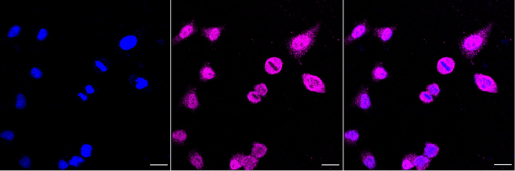 • Immunocytochemical staining of HepG2 cells with AMPK alpha 1 antibody. Nuclei were stained blue with DAPI; AMPK alpha 1 was stained magenta with Alexa Fluor? 647. Images were taken using Leica stellaris 5. Protein abundance based on laser Intensity and smart gain: Medium. Scale bar, 20 μm.