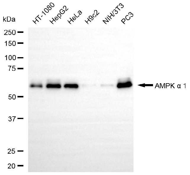 • Western blotting analysis using AMPK alpha 1 antibody. Total cell lysates (30 μg) from various cell lines were loaded and separated by SDS-PAGE. The blot was incubated with AMPK alpha 1 antibody and HRP-conjugated goat anti-rabbit secondary antibody respectively.