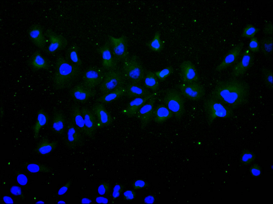 • Immunofluorescence staining of Hela cell with CSB-RA151825A0HU at 1:50 , counter-stained with DAPI. The cells were fixed in 4% formaldehyde, permeabilized using 0.2% Triton X-100 and blocked in 10% normal Goat Serum. The cells were then incubated with the antibody overnight at 4°C. The secondary antibody was Alexa Fluor 488-congugated AffiniPure Goat Anti-Rabbit IgG(H+L).