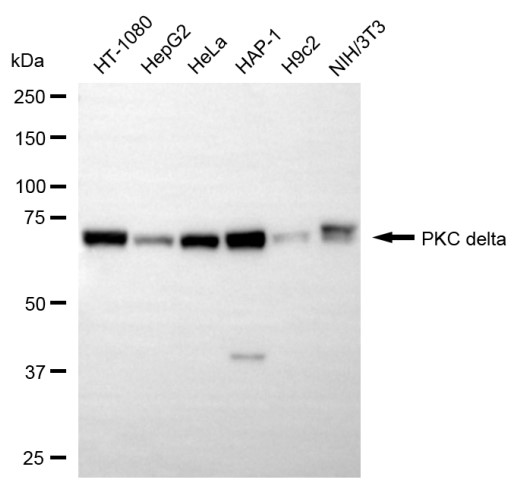 Western blotting analysis using PKC delta antibody. Total cell lysates (30 μg) from various cell lines were loaded and separated by SDS-PAGE. The blot was incubated with PKC delta antibody and HRP-conjugated goat anti-rabbit secondary antibody respectively.