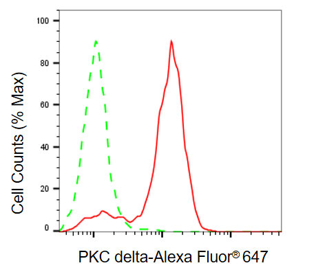 Flow cytometric analysis of PKC delta expression in HAP-1 cells using PKC delta antibody. Green, isotype control; red, PKC delta.