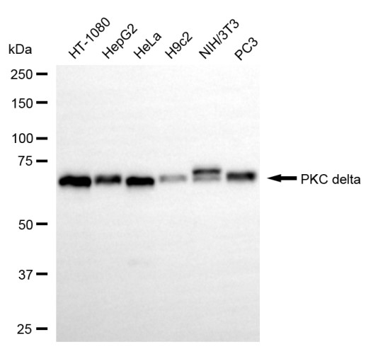 Western blotting analysis using PKC delta antibody. Total cell lysates (30 μg) from various cell lines were loaded and separated by SDS-PAGE. The blot was incubated with PKC delta antibody and HRP-conjugated goat anti-rabbit secondary antibody respectively.