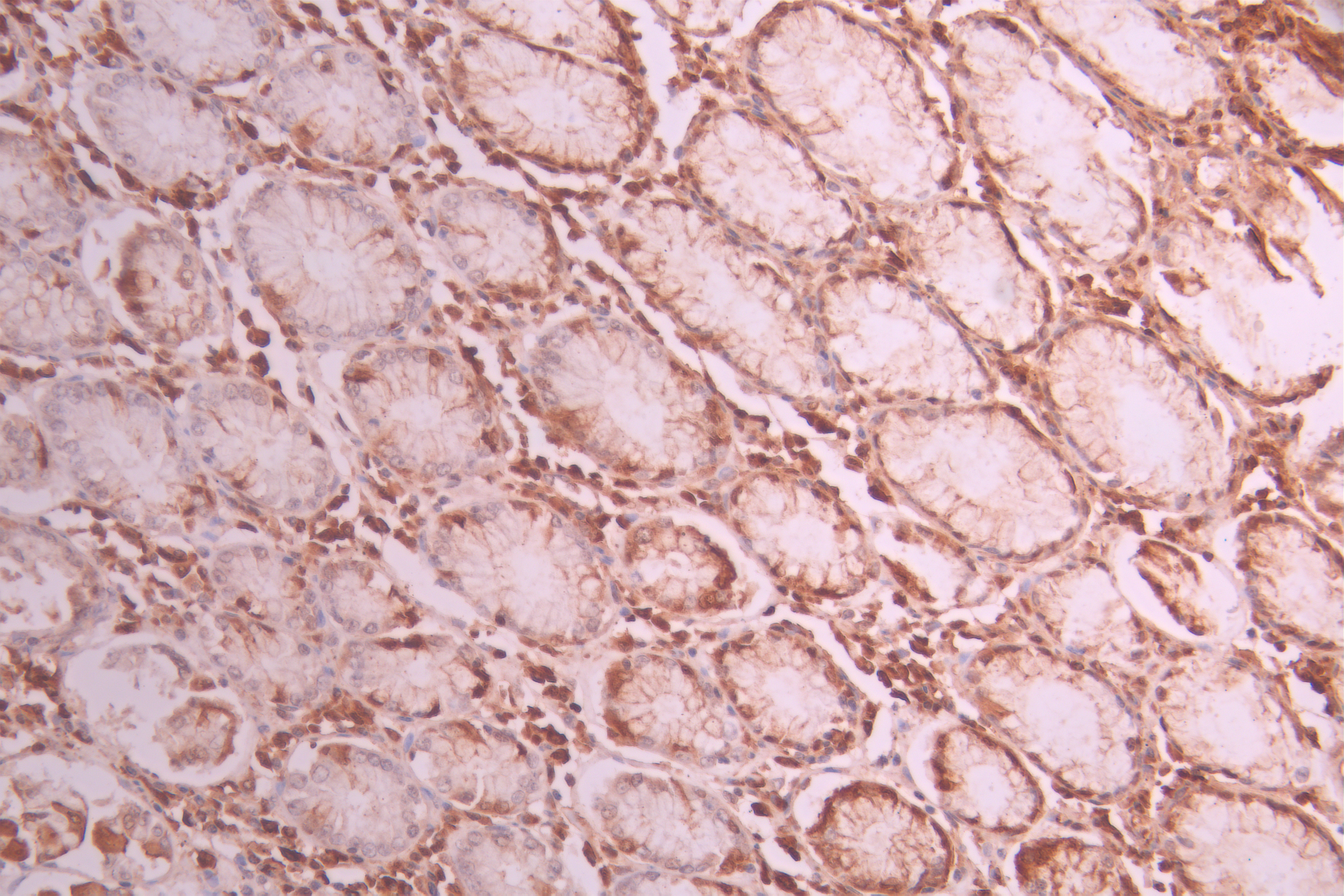 IHC image of CSB-RA998693A0HU diluted at 1:100 and staining in paraffin-embedded human stomach tissue performed on a Leica BondTM system. After dewaxing and hydration, antigen retrieval was mediated by high pressure in a citrate buffer (pH 6.0). Section was blocked with 10% normal goat serum 30min at RT. Then primary antibody (1% BSA) was incubated at 4°C overnight. The primary is detected by a Goat anti-rabbit polymer IgG labeled by HRP and visualized using 0.05% DAB.