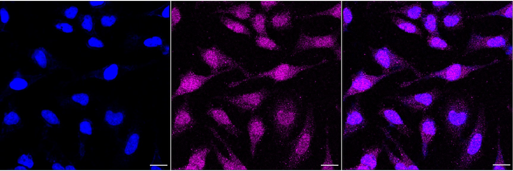 Immunocytochemical staining of Hela cells with Phospho-Presenilin 1 (Ser310) antibody. Nuclei were stained blue with DAPI; Phospho-Presenilin 1 (Ser310) was stained magenta with Alexa Fluor? 647. Images were taken using Leica stellaris 5. Protein abundance based on laser Intensity and smart gain: Medium.Scale bar, 20 μm.
