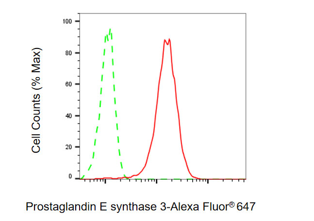 Flow cytometric analysis of Prostaglandin E synthase 3 expression in HepG2 cells using Prostaglandin E synthase 3 antibody. Green, isotype control; red, Prostaglandin E synthase 3.
