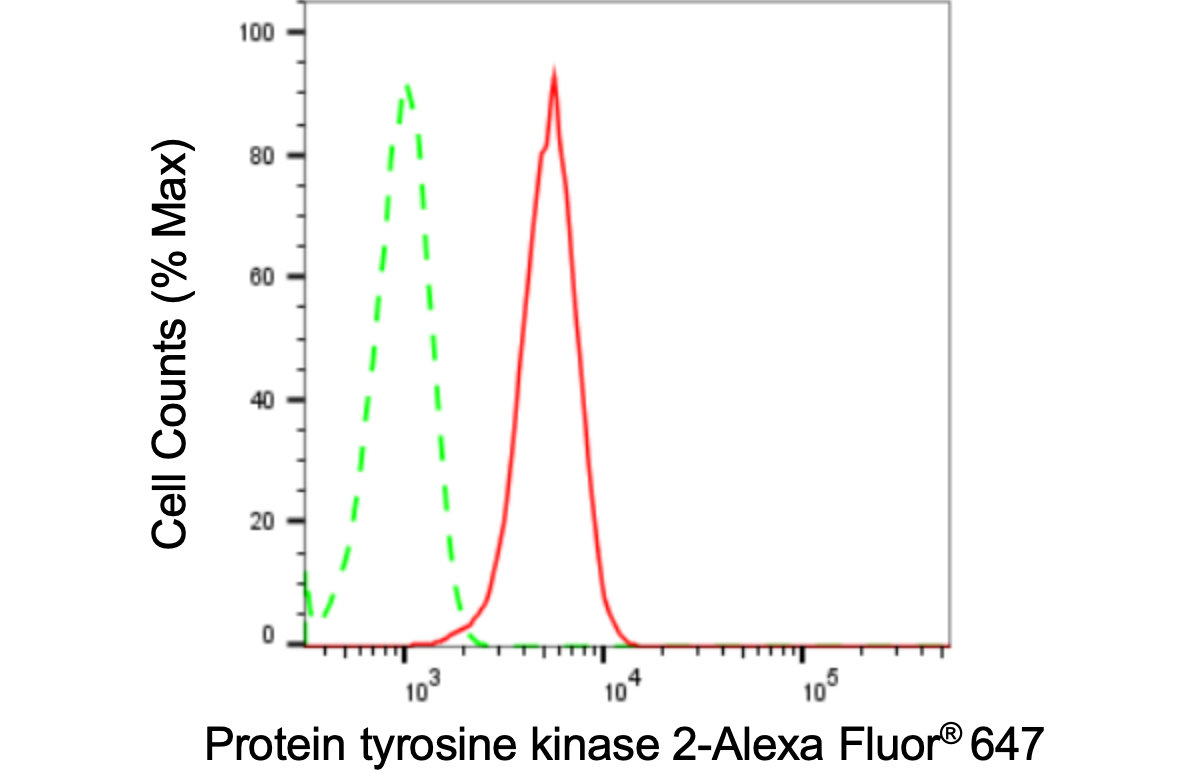 • Flow cytometric analysis of Protein tyrosine kinase 2 expression in C2C12 cells using Protein tyrosine kinase 2 antibody. Green, isotype control; red, Protein tyrosine kinase 2.