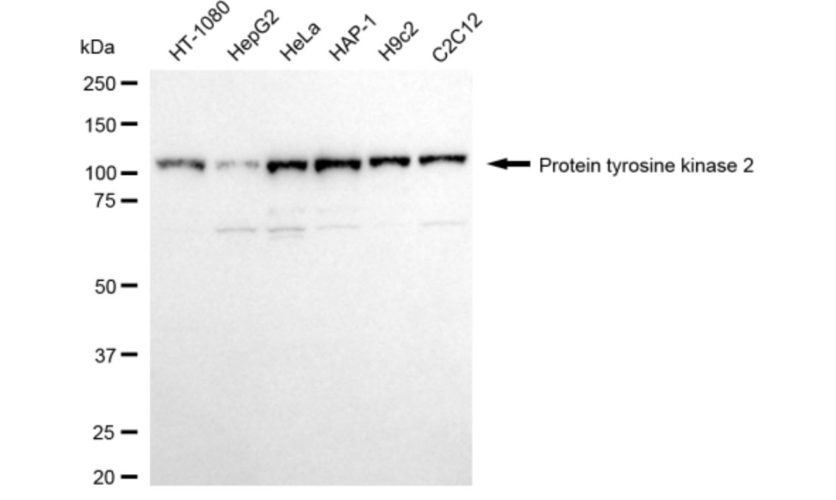 • Western blotting analysis using Protein tyrosine kinase 2 antibody. Total cell lysates (30 μg) from various cell lines were loaded and separated by SDS-PAGE. The blot was incubated with Protein tyrosine kinase 2 antibody and HRP-conjugated goat anti-rabbit secondary antibody respectively.