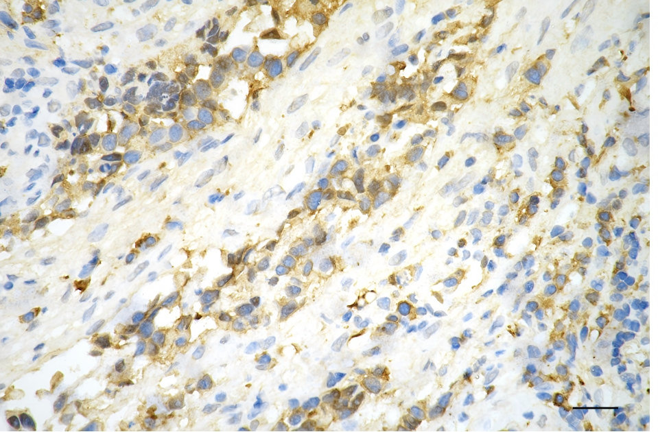 Immunohistochemistry was performed on paraffin-embedded human bladder carcinoma using RAB7A antibody. Antigen retrieval was done in sodium citrate buffer (pH 6.0). DAB was used for detection, with hematoxylin counterstaining. Images were acquired using a Nikon Ci-L Plus microscope (40× objective). Scale bar: 25 μm.