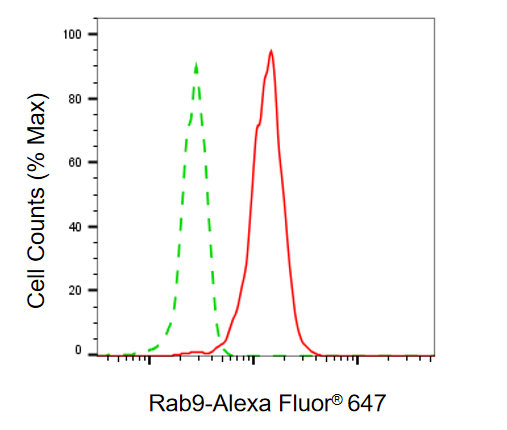 Flow cytometric analysis of Rab9 expression in HepG2 cells using Rab9 antibody. Green, isotype control; red, Rab9.