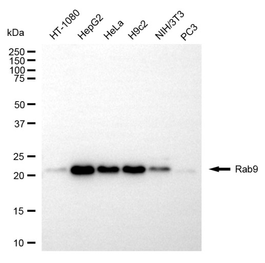 Western blotting analysis using Rab9 antibody. Total cell lysates (30 μg) from various cell lines were loaded and separated by SDS-PAGE. The blot was incubated with Rab9 antibody and HRP-conjugated goat anti-rabbit secondary antibody respectively.
