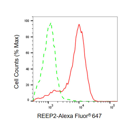Flow cytometric analysis of REEP2 expression in HAP-1 cells using REEP2 antibody. Green, isotype control; red, REEP2.
